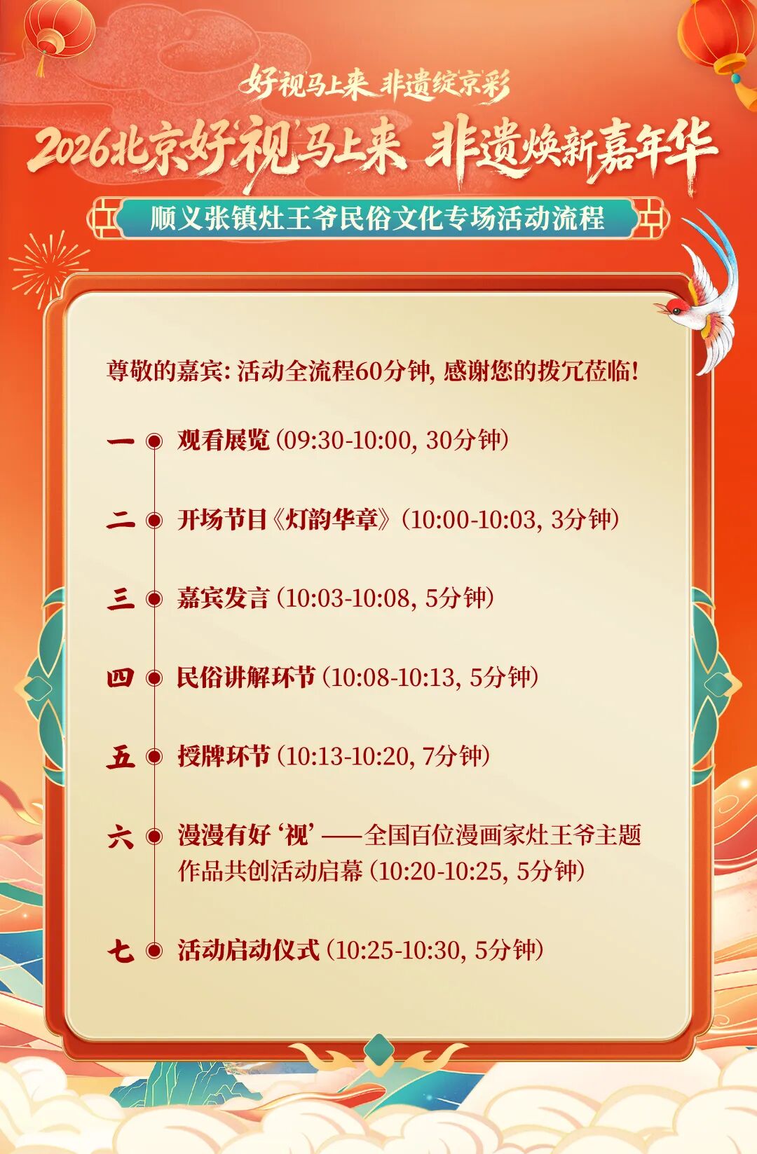 2026年“北京大视听 春天马上来”系列活动--“2026 北京好‘视’马上来 非遗焕新嘉年华·灶王爷民俗文化专场”活动 将于2 月10日(农历腊月二十三,小年)在北京市顺义区莲花山滑雪场正式启幕。本场活动以非遗为根、以视听为翼、以冰雪为景,打造传统民俗与现代文旅深度融合的新春文化盛会。